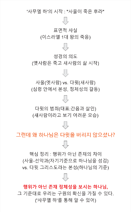 성경의 의도대로 ‘사무엘 하’를 우리 속사람의 이야기로 보면 우리가 일반적으로 설교로 들어 온 관점과 제법 다른 말씀과 뜻이 들어 있음을 알 수 있다. ‘사울이 죽은 후’라는 시점을 선언하고 시작한 것은 옛사람이 죽은 후, 즉 새사람으로 거듭난 삶이 시작된 이후의 이야기라는 걸 선언하고 시작한 것이다. 그러니까 ‘사무엘 하’의 말씀은 거듭난 사람의 이야기인 것이다.