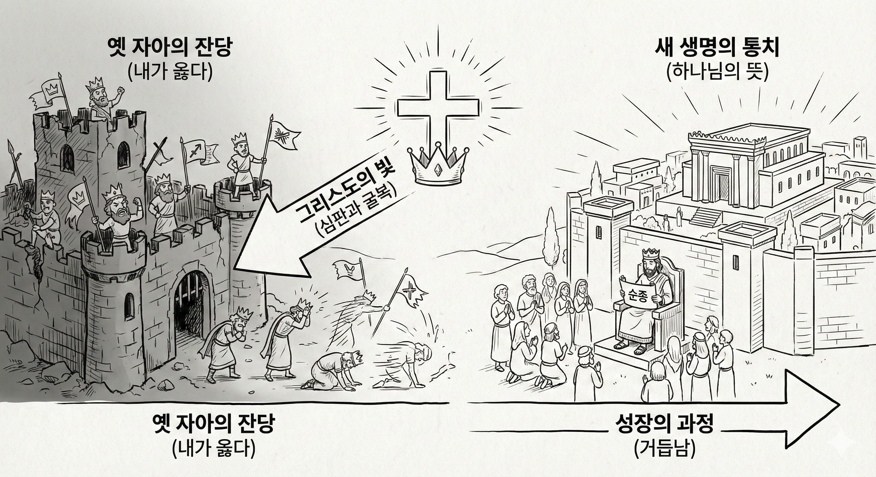 그리스도로 거듭난다는 건 곰이 여자가 되는 것 같은 드라마틱한 변화를 의미하지 않는다. 육신의 삶이 가진 모든 요소들이 그리스도의 본성이 자라면서 하나씩 하나님께서 원하시는 목적 앞에 굴복하며 내 삶이 하나님께서 나에게 인생을 주신 목적을 이루도록 주권을 회복하는 것이다. 그래서 죄는 자리를 떠난 것이고, 회개는 가던 길을 돌아 가는 것이다. 선악과를 먹은 아담에게 물으신 하나님의 질문, “네가 어디 있느냐?”라는 말씀 앞에 “주여 내가 여기 있습니다”가 되는 것, 그게 거듭남이고, 내 삶이라는 한 세계를 온전히 하나님의 뜻대로 다스리는 왕이 되는 것이다.