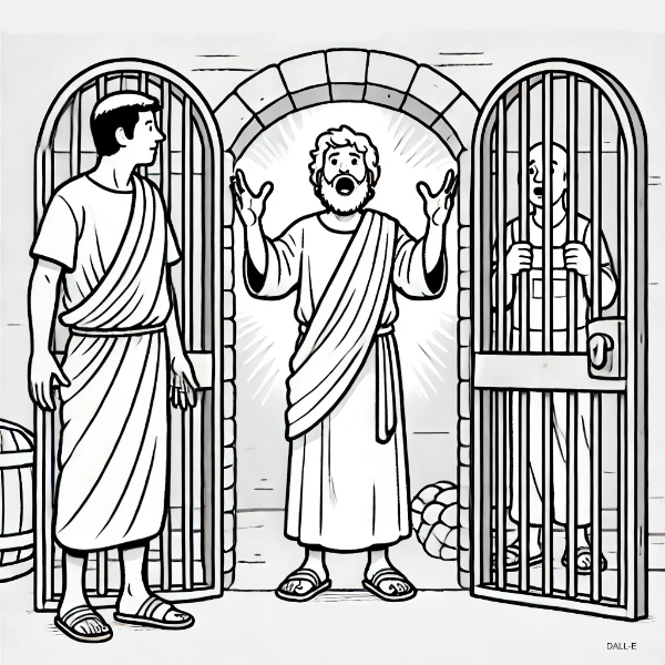 점치는 여종에게서 귀신을 쫓아내자, 여종의 주인은 상관들에게 바울과 실라를 송사했고, 상관들은 바울과 실라를 채찍으로 때린 후 옥에 가두었다. 그런데 밤에 옥터가 흔들리고 옥의 모든 문이 다 열리며 갇힌 사람들의 매인 것이 다 풀어졌다. 놀란 간수가 일어나서 상황을 보니 모든 죄인이 달아난 줄로 알고 스스로 자결하려 했는데, 사도 바울이 자신이 도망가지 않았으니 몸을 해하지 말라고 외치는 소리에 멈추고는 오히려 자신이 어떻게 하면 구원을 얻을 것인지 묻는다.