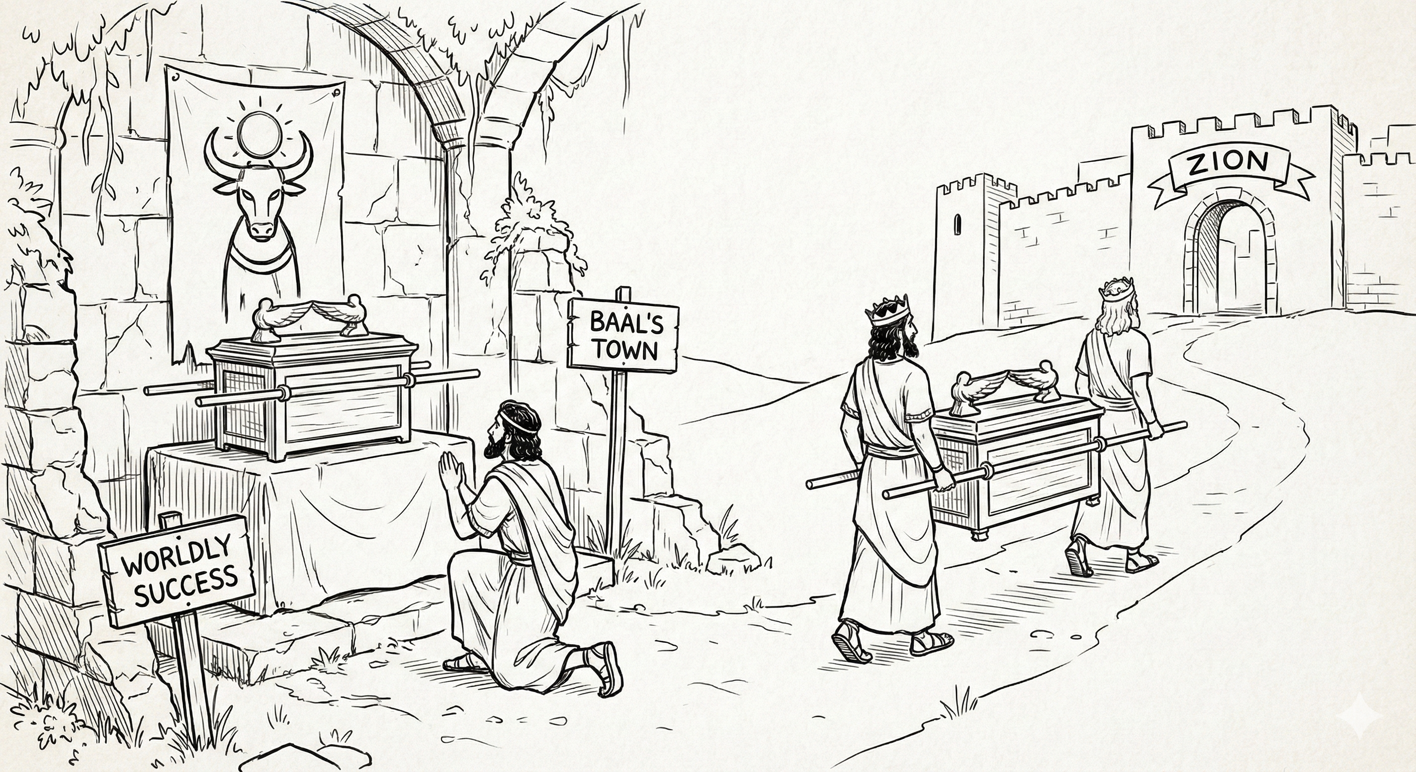 그러므로 다윗이 바알의 성읍에서 하나님의 언약궤를 찾아오겠다고 한 것은 하나님을 믿는 사람은 하나님의 언약과 말씀을 세상에서 출세하고 평안을 누리는 복을 얻기 위한 수단으로 여기는 마음에서 내 인생의 목적과 나를 주관하는 의로 여기고 순종하여야 함을 말씀하시는 것이다. 우리가 하나님의 말씀, 하나님의 약속을 세상의 성공을 약속하신 말씀으로 봐야 하는지, 아니면 나의 인생이라는 나라를 다스리는 의와 가치로 여길 것인지를 돌아봐야 한다. 만약 나에게 하나님의 약속은 바알 아래 있다면 다윗처럼 시온으로 가지고 와야 한다.